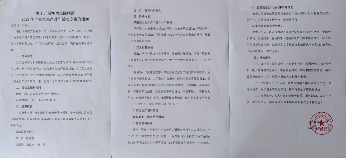 根據(jù)國家、省、市、區(qū)相關(guān)文件精神,結(jié)合公司實(shí)際,海南皇隆制藥股份有限公司制定了2023年“安全生產(chǎn)月”活動(dòng)方案,并開展了以“人人講安全,個(gè)個(gè)會(huì)應(yīng)急”為主題的系列活動(dòng),進(jìn)一步提升了公司全員安全意識和應(yīng)急處置能力。