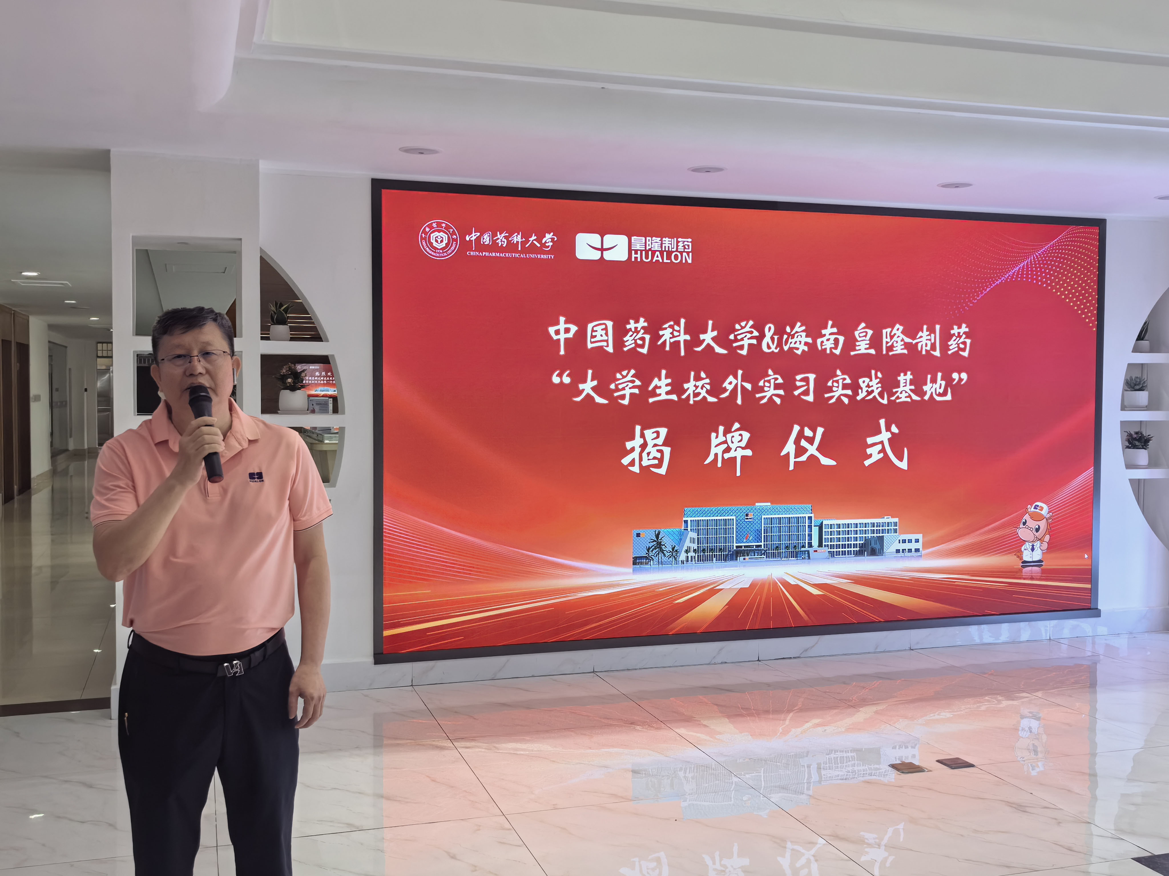 7月29日,中國(guó)藥科大學(xué)“大學(xué)生校外實(shí)習(xí)實(shí)踐基地”揭牌儀式在海南皇隆制藥股份有限公司舉行。中國(guó)藥科大學(xué)藥學(xué)院黨委書記張仕英與海南皇隆制藥股份有限公司董事長(zhǎng)陳益智分別代表合作雙方揭牌。揭牌儀式由海南皇隆制藥股份有限公司常務(wù)副總經(jīng)理史江永主持。